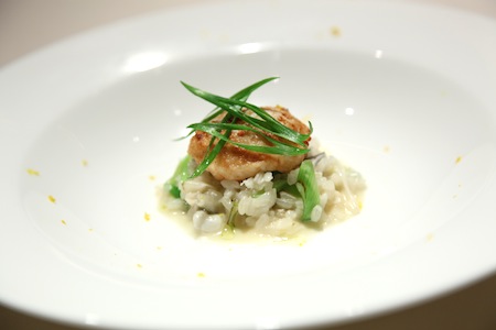 ◎虎河豚・うぐいすのコンフィーと白子のリゾット 九条葱と黄柚子の香り
