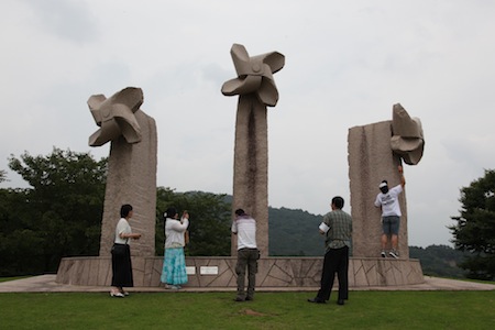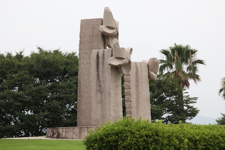 熊本県山鹿市(旧鹿本町)にある「石のかざぐるま」。高さ5.5m、材質は赤みかげ石 (スペイン産)で、羽根の大きさでは日本一、九州唯一の石のかざぐるま。何と、風速3 m(ススキの穂が揺れる程度の風)でこの大きな石の羽根が回ります。