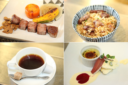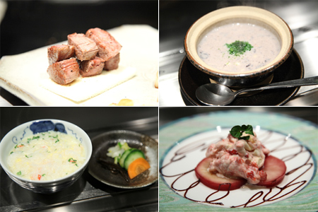 肉もさることながら、同レストランの名物に「黒豆呉汁(くろまめごじる)」がある。今日はアクセントと〆に、蟹雑炊と苺&林檎のデザートだった。