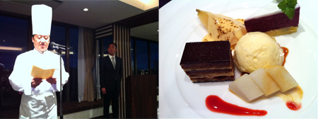 宴にサーブされた料理は和洋折衷のもので、同館シェフたちが渾身を込めて作り上げた料理である。彩り、盛り付けともなかなかのレベルを感じた。