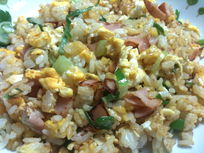 冷蔵庫を開くと、ロースハム、長ネギ、卵1個が残っていた。どれどれフライパンに油を注ぎ加熱して食材を炒め、1人前残っていた炊飯器から白御飯を取り出し、フライパンを振って米粒がコロコロ、ピンピンと跳ねるまで・・・。