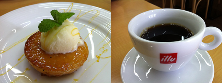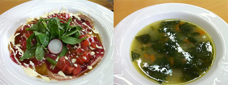 本日のランチメニューは、「羊肉のカルパッチョ」、「ほうれん草とサツマイモのスープ」、「ひら茸とゴルゴンゾーラのパスタ」、「スペアリブ」、「焼き林檎」、「illy珈琲」だ。