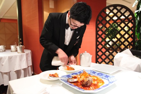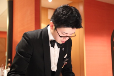 その時、同料理長から「是非、自分でサーブさせて下さい。」と若いギャルソンが待機していると言う。自分が休みというのに、取材会場に立ち会ったり、積極的に見聞を広める努力をしている人物のようだ。