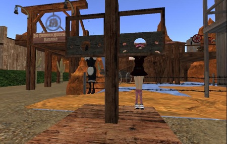 かなりプリムが必要な大建造物や山々。ゴーカート、メリーゴーラウンド、お城、山、川など沢山のオブジェが整然と置いてある。コルク栓の弾を使ったライフルで標的を撃ったり、その他ショップもあるようだ。実は頭に付けるネズミさんの帽子があるかどうか見に行ったのだが、見つける事は出来なかった二人。