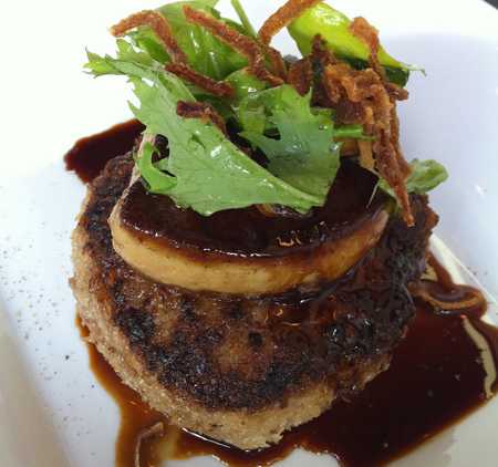 本日は出張などの理由で参加者が少なかったので、同レストランに依頼して200グラムの特大ハンバーグに大きなフォアグラの帽子をかぶせてもらった。予想以上に大きなフォアグラにびっくり!