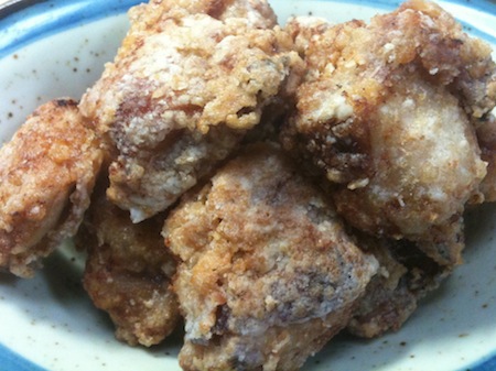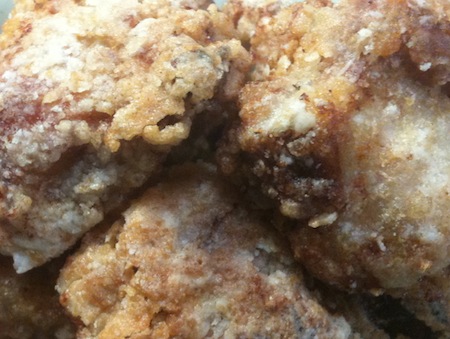 漬け込んでいた鶏を片栗粉で包み込む。片栗粉を多めにすると、カリカリ感があり、あたかも量が増したかの様な錯覚を楽しめるので、十二分に絡ませる。(ここがミソ)