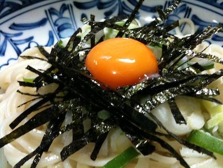 ◎乾麺の讃岐うどんを・・・待つ事15分。葱、卵黄、海苔・・・つけ麺で!!