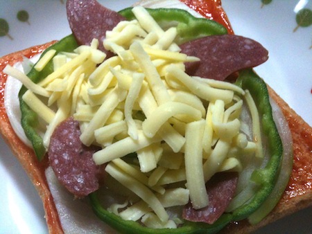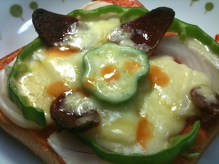 しかし栄養補給をしないと頭が回らない。そこで冷凍しておいた食パンをベースに、なんちゃってサラミ、タマネギ、ピーマンと、チーズとケチャップで手抜きピザトーストを作る事にした。