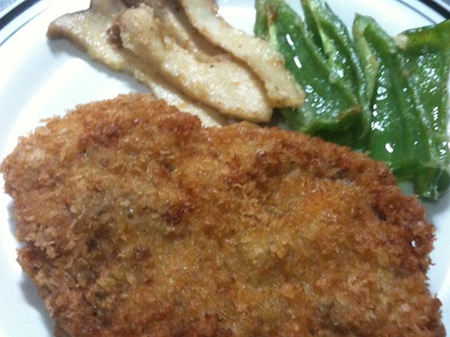 小麦粉まぶして、卵でコーティング、更に2度目の小麦粉まぶして卵コーティング。それからパン粉(無い時は、干上がったフランスパンを粒状にしても美味い)をまぶして、油で揚げる。