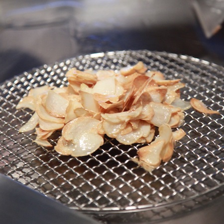 黒毛和牛、それに新鮮な天草の海鮮料理との組み合わせが同レストランの特徴だ。ニンニクを丁寧に包丁で刻み、更に鉄板に油を注いで泳がせる。こんがりとキツネ色に染まる寸前で、金網の上で油切り。