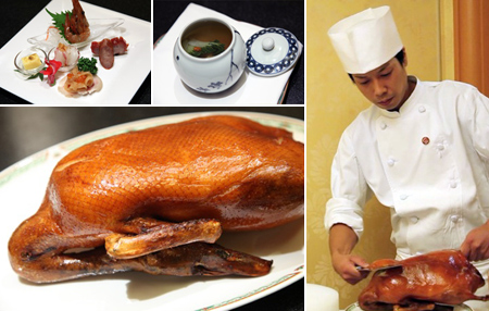 2枚目の写真で特筆すべきものは何と言っても北京ダック。今回は個室にて、そのカービングサービスの実演を披露してもらった。中華包丁でダックの皮を薄く剥ぎ取る作業だが、鮮やかな技法は圧巻である。