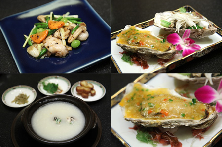 4)宮城県産カキの二種炒め(葱ソース、辛味ソース)