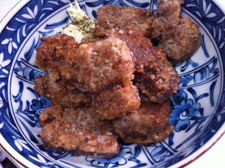 一口サイズにカットした馬肉を、拘りの出し汁(お醤油、17年ものの大吟醸の古酒ほか調味料)に浸け、片栗粉をまぶして揚げて行く。