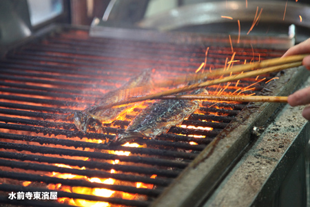 店主が三本の菜箸(右手に2本、左手に1本の箸)を操り、鰻が舞うように焼かれて行く。青黒い筋の見える鰻の皮の部分が、じわじわと黄金食に色づき香ばしさを増して行く。垂れる鰻の油が、一瞬の内にジュジュっと炎と替わる瞬間がたまらない。