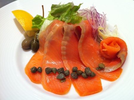生ハムとフルーツ、シーザーサラダ、スモークサーモンと野菜、明太子パスタと冷製パンプキンスープ&ウィルキンソンのジンジャエール。