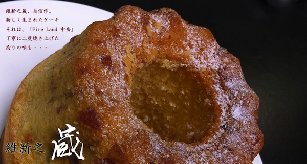 終了間際に「維新之蔵」のオーナー岡部國光氏から手渡された新作のケーキ。・・・良く見ると、ドライフルーツや発酵バターをふんだんに使い、二度焼きをした新しいスタイルのケーキであった。