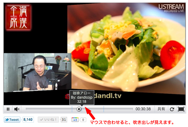 勿論、ライブでTWITTERなどで絡むUSTREAMの特徴でもあるが、リアルタイムに見れなかった方で、視聴する時間が十分無く番組を全てが見れない時などに利用すると実に便利!!・・・「ハイライト」開始部分を示す「縦の青線」にアンカーポイント(マウス矢印)を合わせると、「ハイライト」のタイトルや簡単な説明を吹き出しで確認出来る。