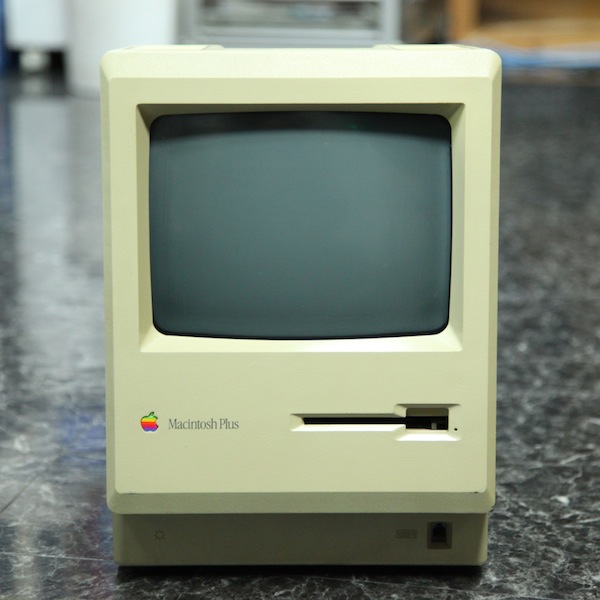 ドキドキしながら、その箱をそーっと開いて行った。ビニールをちぎるように破り、取り出した物がMacintosh(128K)であった。結構、どっしりと重かった。・・・残念ながら上写真はMacintosh Plusだが、現在、オフィスの倉庫の何処かに、最初のMacintoshの他、もう1台のMacintosh Plus、DynaMac(アップル社からは正式に認定されなかったような記憶がある)、Macintosh SE/30、Macintosh Classic、Macintosh Classic II、Macintosh Color Classicのいくつかは眠っているはずである。