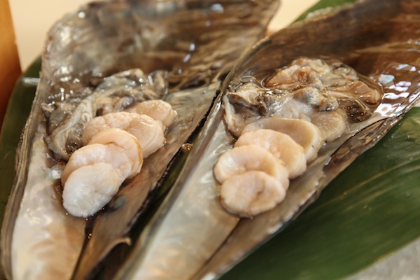 今回ご紹介するのは、2年程前に福岡の某鉄板焼レストランでサーブされた、なかなか質の良い「タイラギ」である。独特な形状と貝殻表面の柄が特徴のこの貝。貝殻がでかい割には、貝柱がすこぶる可愛い。