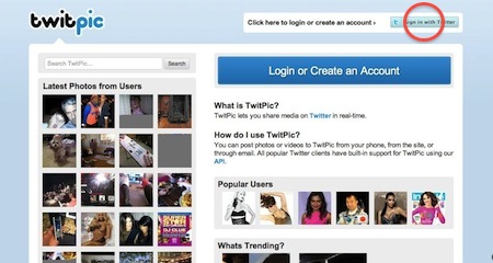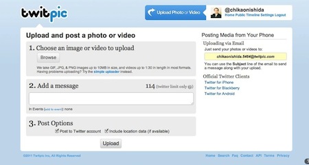 1)先ず、写真(上)の画面のように http://www.twitpic.com/ のサイトをブラウザで開いて、自分のTwitterアカウントでログインする。