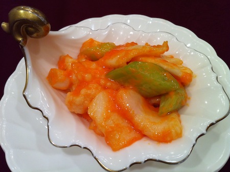 先週末、同レストランマネージャーに電話して、「サンラー湯麺」をメインとしたものを注文しておいた。最初は優しい味の「イカと蟹」、「牛肉と上海白菜」・・・だったのだが、ここで頭髪が立ち上がってしまいそうな「サンラー湯麺」の登場だ。