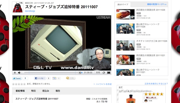 先日、逝去した偉人スティーブ・ジョブズ氏(前Apple社CEO)の追悼特番の放送を、レギュラー番組「満漢全席」において試みた。リアルタイムでも多くの視聴者においでいただき、その後USTREAM録画及びYOUTUBE録画へのアクセスが、徐々にではあるが増加しているようだ。