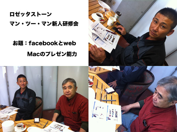 10月26日(水)は実に慌ただしい一日だった。正午から「ロゼッタストーン新人研修会/facebookとweb、Macのプレゼン能力など)」に、水前寺東濱屋とカーメイク・ドルフィンが参加。マン・ツー・マンの研修会に積極的な質問、意見が飛び交った。ちなみに、天草方面からの参加者は時間が合わず、今回は見送った。(残念!)