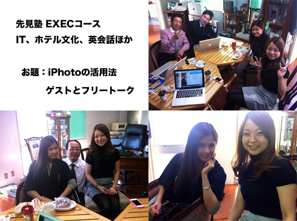 また、午後3時から午後6時までは、毎週開催されている「先見塾EXECコース」。今回はゲストを招聘して、フリートークの英会話、MacのiPhoto活用法(復習)などを体験して頂いた。参加者の9割がiPhone利用者。アプリの更新や人気アプリなどの紹介を行い、高速Wi-Fiからダウンロードしてもらった。