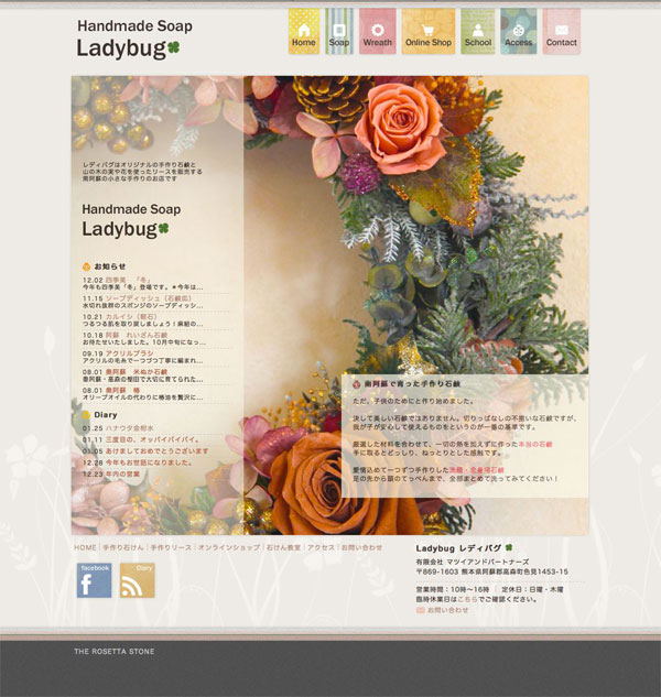 本日、南阿蘇の手作り石けんとリースのお店 「Ladybug(レディバグ:英語でてんとう虫の意味)」の公式サイトが、ロゼッタストーン上にプレオープンする運びとなった。まだまだコンテンツの微調整やリースの個展ページの追加など必要だが、素敵なサイトは1秒でも早くお知らせしたく思い、本日プレオープンすることに。