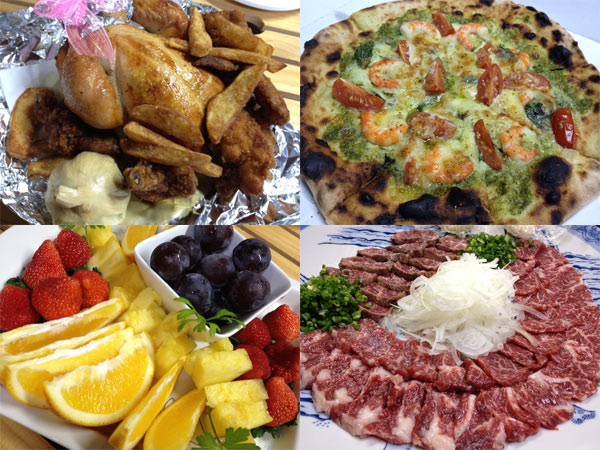 当社からは、鶏料理よしだの「雛鳥の丸揚げ4羽」、わさびルーレット用の壽し匠 都壽しの「わさびドッカリ握り寿司」、MIA PIZZAの「特大ピザ5枚」を準備し、その他、美食 宮地からは「熊本名物の馬刺」、スタッフからは「果物の盛り合わせ」、その他ケーキやビールなどが持ち込まれた。