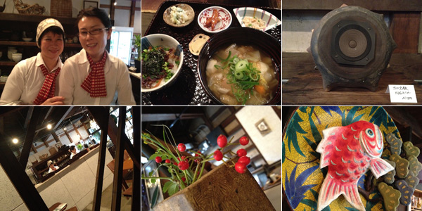 ランチで食した「器季家カフェ定食/1000円」は健康食そのもので、団子汁、馬肉丼、ポテトサラダ、大学芋、おから、お新香といった取り合わせ。実にシンプルだが愛情たっぷりの母親が作りそうな料理である。周囲は女性ばかりのランチタイムのようで、笑い声が絶えない。・・・少々遠慮気味に団子汁の大きな器を手にした。