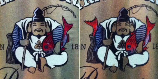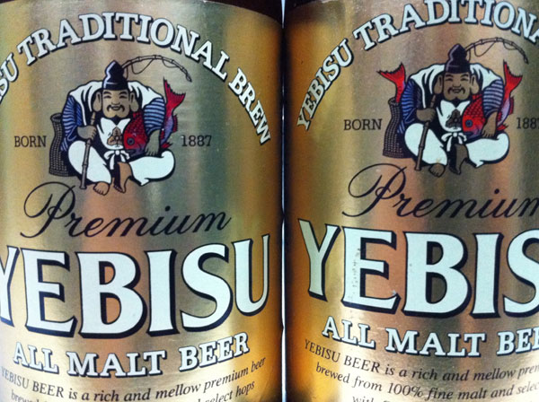 リビングルームにあるYEBISU瓶ビールのラベルをよく見ると・・・何か違う。左の瓶は恵比寿様と鯛1匹、右は鯛2匹となっている。これは決して画像修正をしたものではありませぬ。