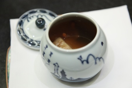・絹傘茸の血燕と蛤士蟆 タラバ蟹蒸しの 天草 天然塩ソースがけ