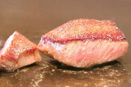 写真のようにコースの中に出てきた「極上のタン」。まあ、こんなにも分厚いタンをどうやって食べるのか?肉に拘りに拘る、自らを肉の変態と呼ぶ吉田シェフだが、このタンを2時間も叩いていたと言うのだ。