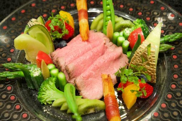 冒頭から話が外れてしまったが、本日のテーマは「洋食の盛り付け」である。写真群は、同ホテル1階にあるダイニングキッチン九曜杏の料理長や工藤佳吾セカンド、そしたアシストに回った若手シェフたちの力作である。最近では、筆者が「万華鏡」という料理名を勝手につけた・・・中央に肉類、そして周囲にありとあらゆる野菜や果物を盛り付けたものがある。
