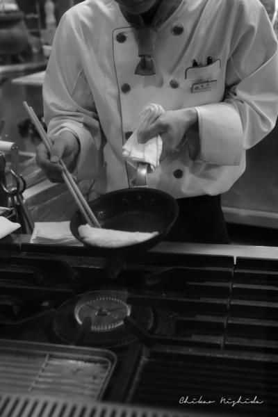 よって、会合後の午後4時頃に、その彼を指名して「軽めのオムライスを作って欲しい!」とオファーを掛けた。ガラス張りの厨房は、金魚鉢のように丸見えで、彼のフライパンの手捌きをじっくりと観察しながら、ガラス越しに撮影させて頂いた。