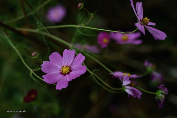 様になるのは、やはり秋桜である。秋桜は弥次郎兵衛のようにじっとしていない。よって、レンズも標準なので、屈んで下方の秋桜を写すことにした。