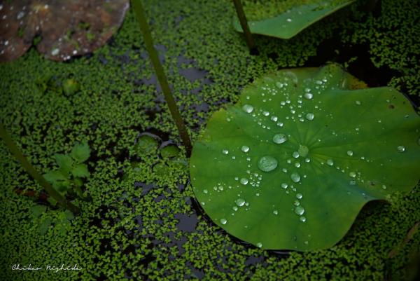 デジタルな話は横に置いて、「蓮園」を取材するのは、どうしても炎天下を避けたいので、ほとんどが雨降りか雨上がりの後を選んで撮影することが多い。「蓮園」には、ニョキニョキと伸びる蓮の葉っぱと、水面に浮く睡蓮の葉っぱがある。雨が上がると、蓮の葉っぱには面白いように水玉があり、風に吹かれる葉っぱとシンクロして、水玉がコロコロと転がっている。